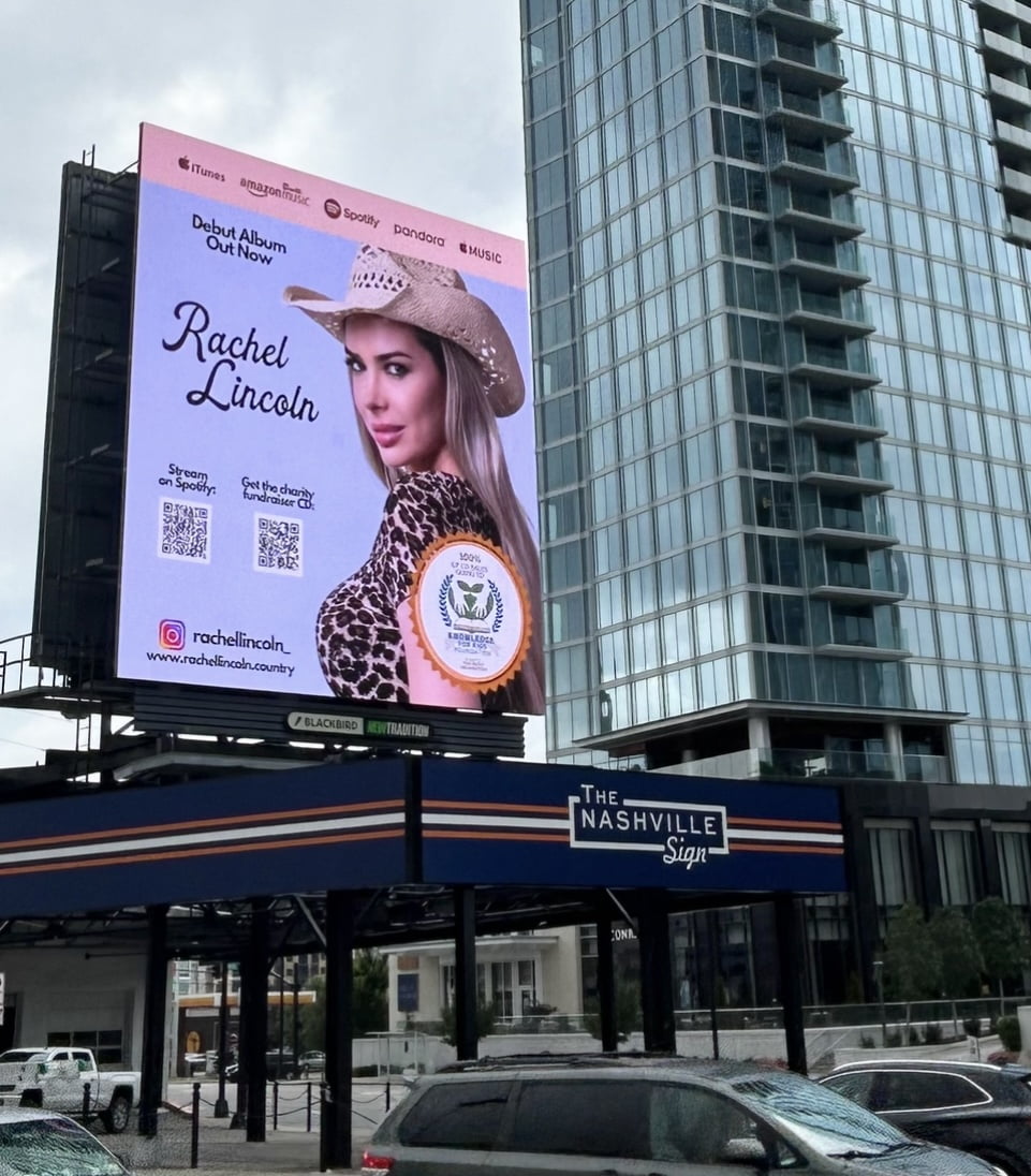 Did you see Rachel on The Nashville Sign? Rachel appeared on famous billboard on Music Row, The Nashville Sign, in Nashville, Tennessee for a week promoting her new album! Proceeds from all CD sales are going to nonprofit organization, Knowledge For Kids Foundation. You can get the CD here